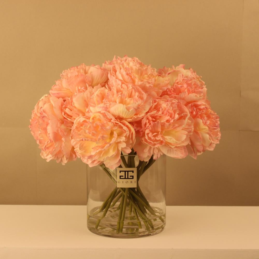 باقة مصممة بعناية، تضم ورود البيوني بلون وردي سكري ناعم، شبيهة جدًا بالطبيعية ومثبتة داخل فازة زجاجية شفافة بمادة تحاكي الماء، تدوم لسنوات بدون أي عناية.