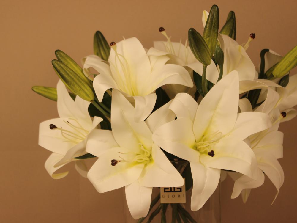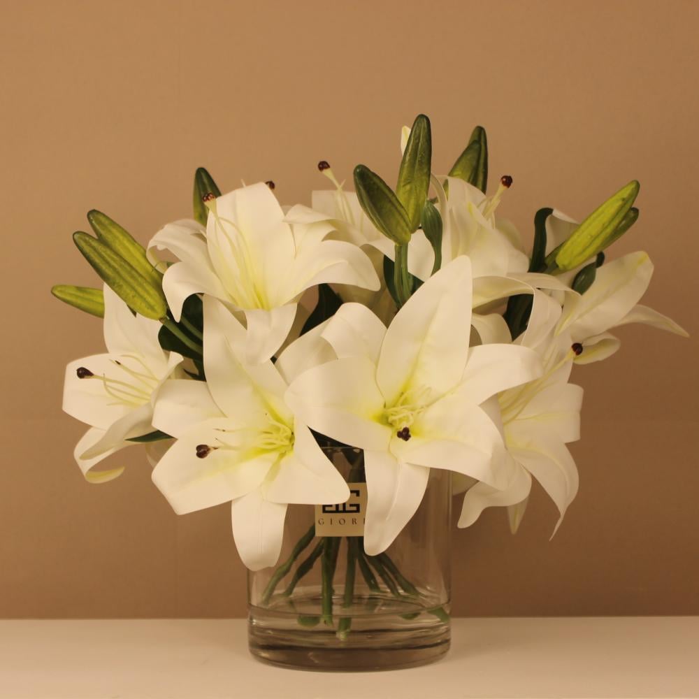 تجسد هذه الفازة روعة زهور الكازابلانكا البيضاء بأوراقها الحريرية وبتلاتها الكبيرة الناعمة التي تنبض بالحيوية. ألوان الأبيض النقي مع لمسات الأخضر في الأوراق والبراعم تمنح التنسيق توازنًا بصريًا راقيًا يوحي بالحياة الطبيعية.