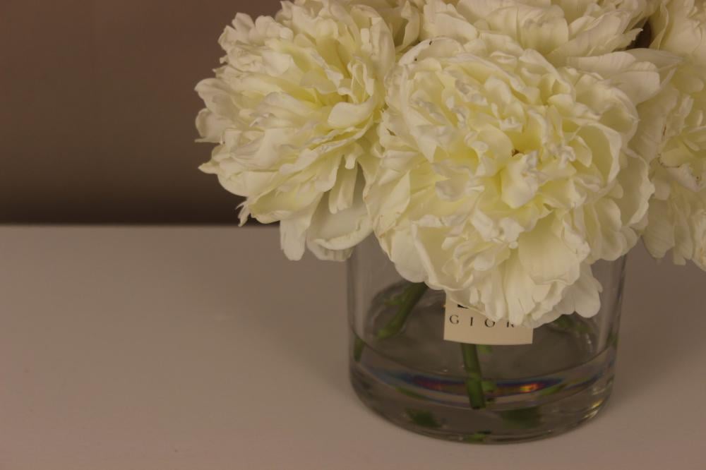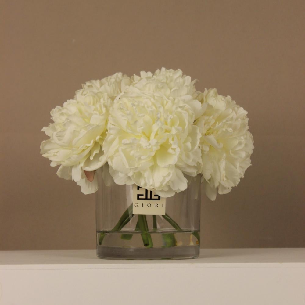 فازة بيوني صناعي بلون عاجي ناعم وتنسيق كثيف داخل فازة زجاجية شفافة مثبتة بمادة تُشبه الماء. تصميم أنيق ومتماسك يضفي دفئًا هادئًا على الطاولات الجانبية أو المداخل الصغيرة .